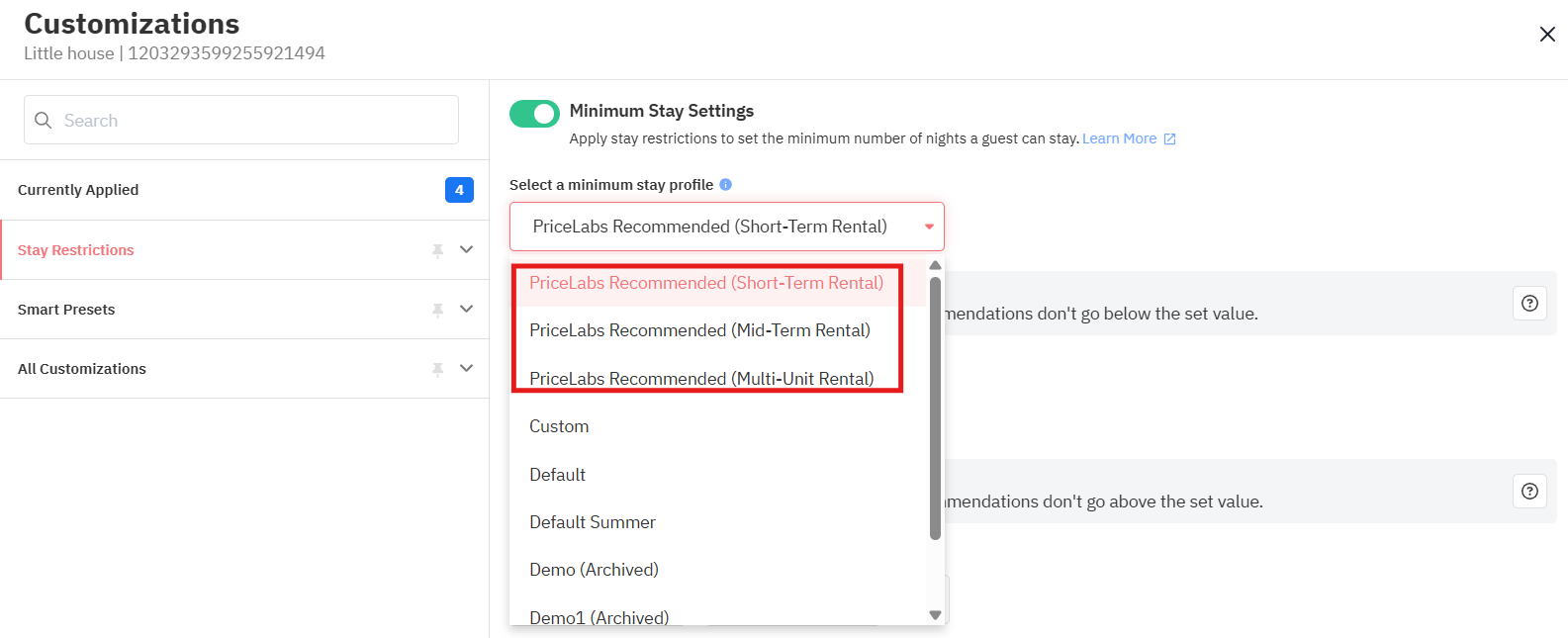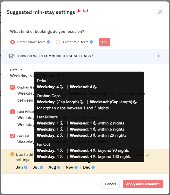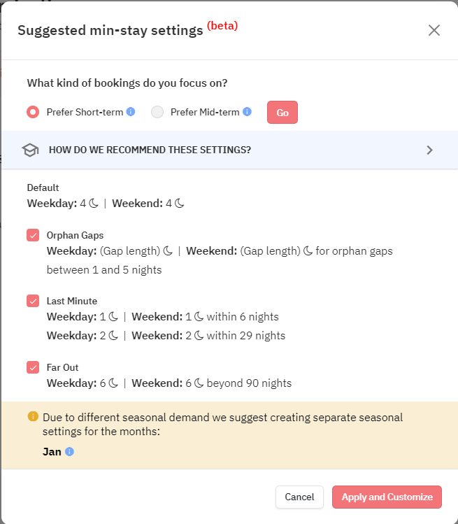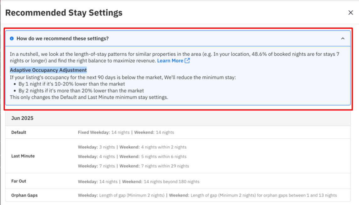 Nossas recomendações podem ser editadas antes de serem aplicadas a uma propriedade. Você pode consultar nosso guia completo sobre estadias mínimas para obter mais detalhes.