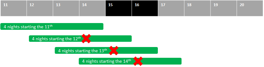 Assim que as duas noites (15 e 16) são reservadas, não é apenas a diária do dia 14 que sofre uma queda na demanda potencial, mas também outras noites próximas a ela. Por exemplo, muitas reservas com duração de uma semana que antes teriam sido feitas para o dia 11 agora não poderão ser feitas.