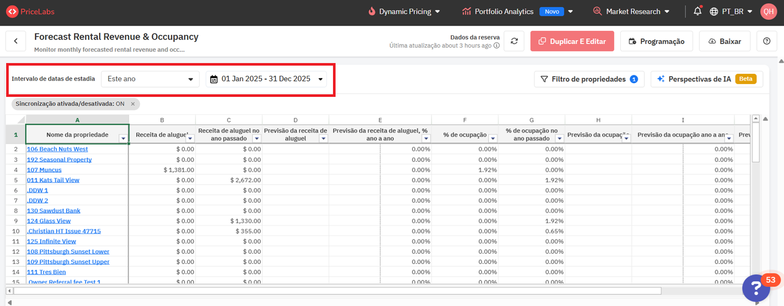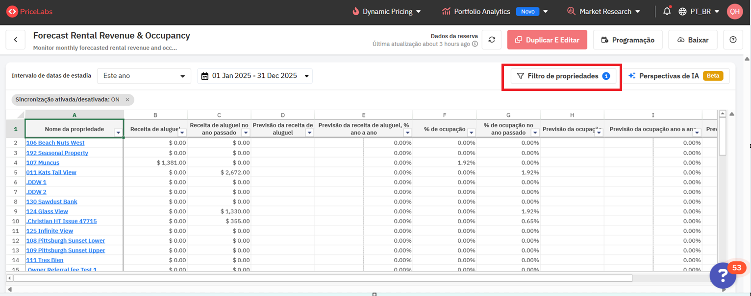 os filtros de propriedade, como nas demais seções do PriceLabs.