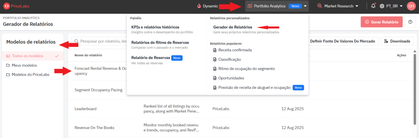 - Em Modelos de relatórios, selecione a opção “Todos os Modelos” ou “Modelos do PriceLabs”