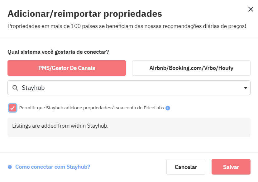 Selecione “PMS/gestor de canais” e escolha “Stayhub” no menu suspenso.