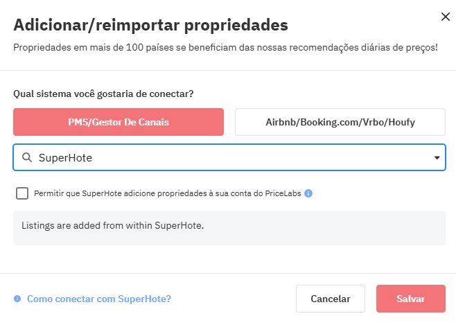 Selecione "PMS/gestor de canais" e procure por SuperHote no menu suspenso.