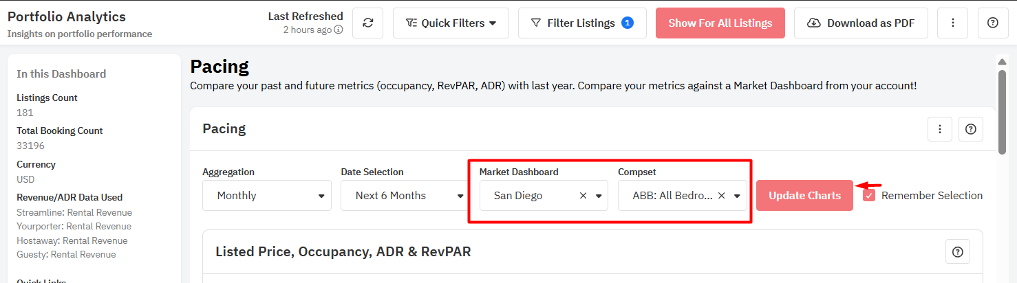 Compara KPIs de nível de portfólio (preço publicado, taxa de ocupação, preço médio da diária, RevPAR) com a média do grupo concorrente do Market Dashboard, perfeito para gestores de várias propriedades.