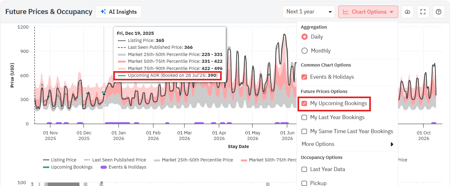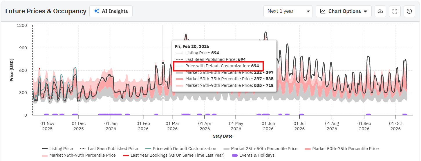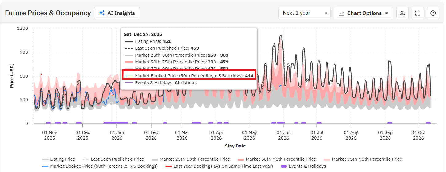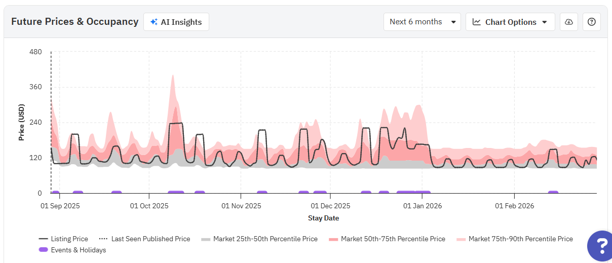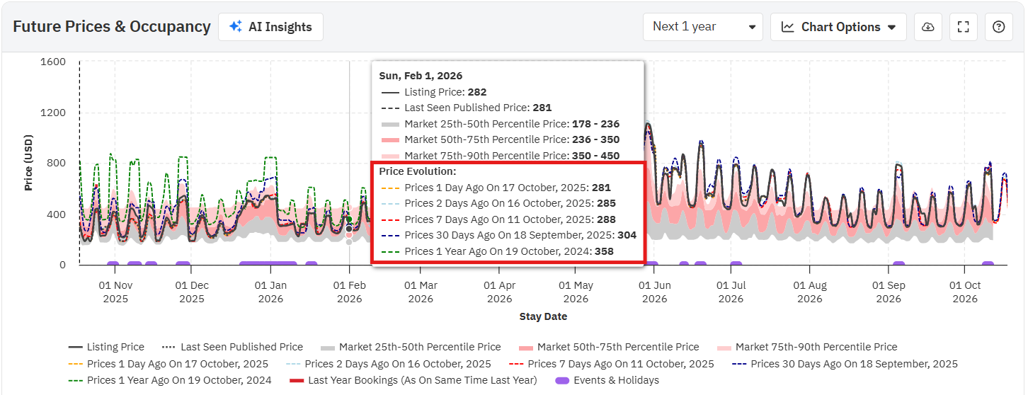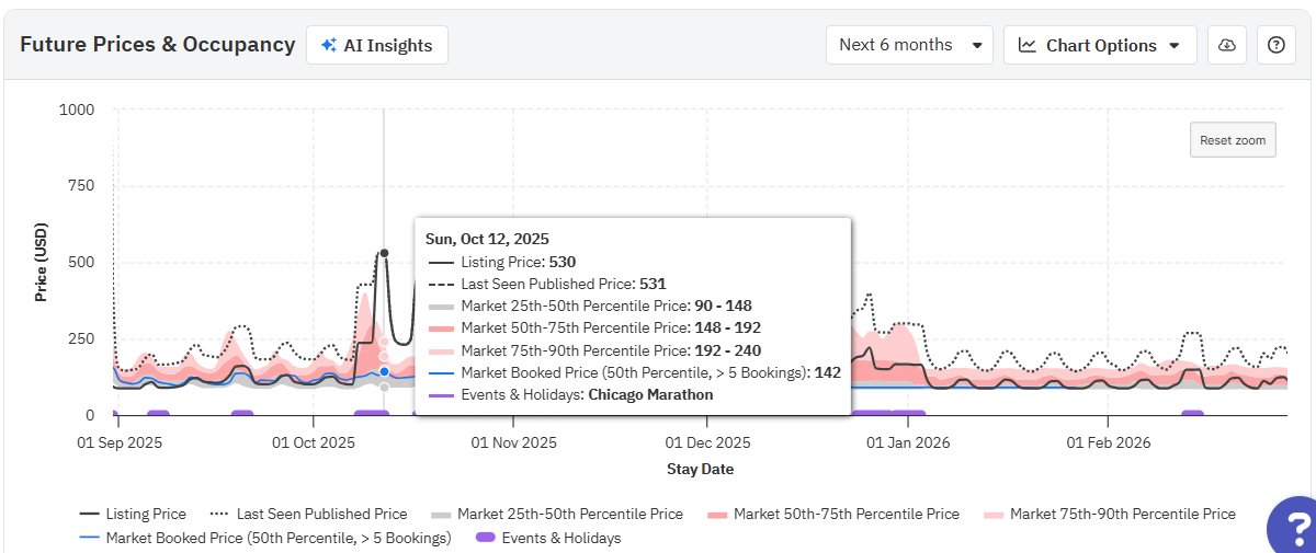 Ao passar o mouse sobre o gráfico, você verá os preços reais para essa data, tanto o último visto quanto o final, juntamente com os preços dos percentis 25, 50 e 75 (o mínimo, a média e o máximo para o seu bairro). Preste atenção a cada campo ao longo do ano; os preços na última visualização e da propriedade irão variar dependendo de como se posicionam em relação aos preços dos concorrentes.