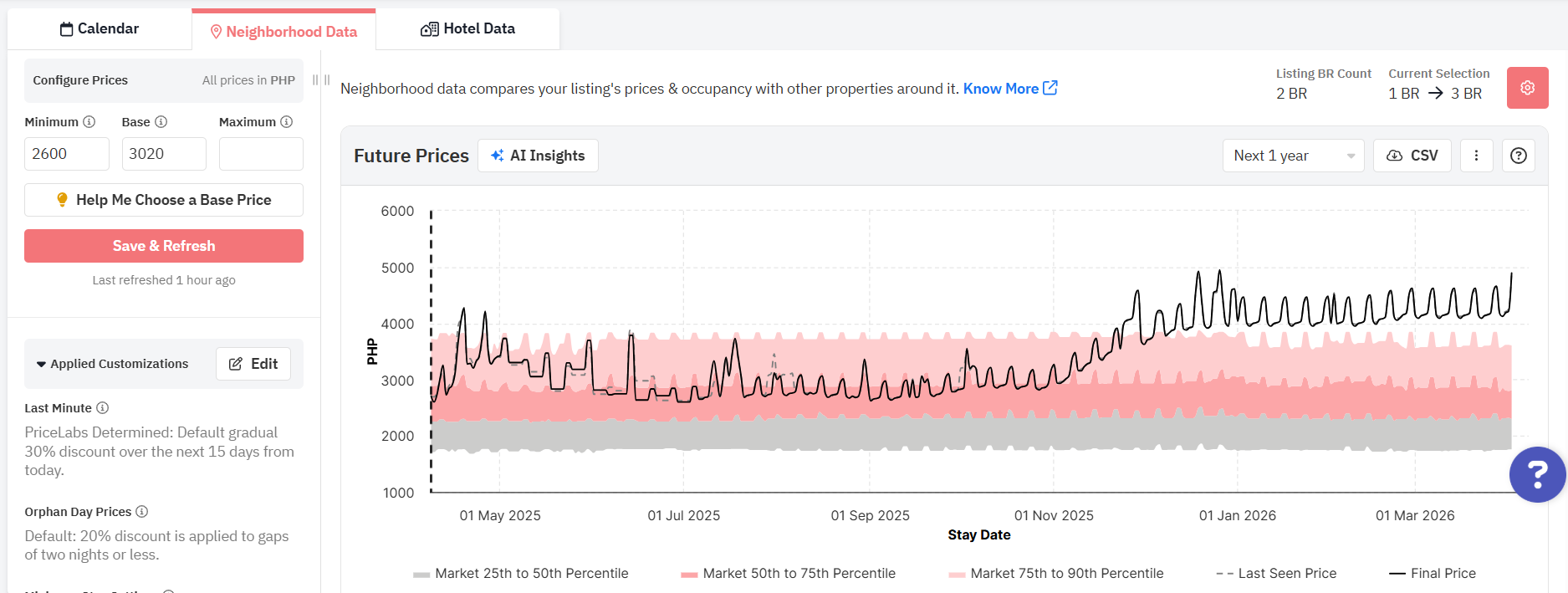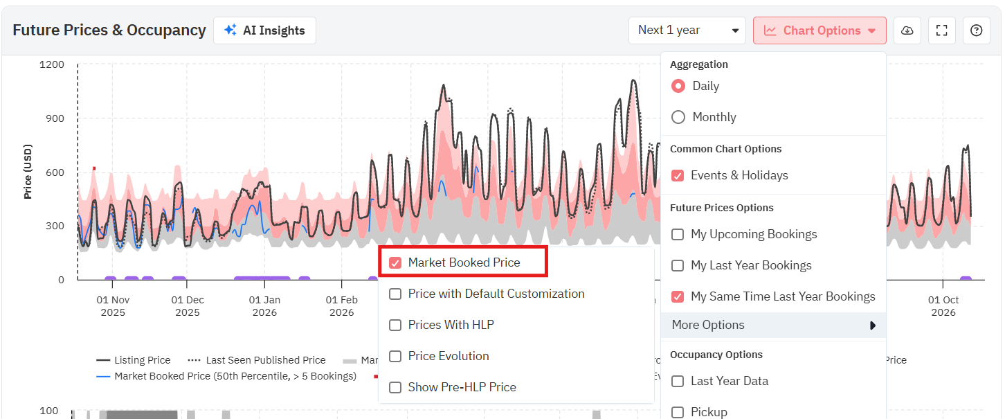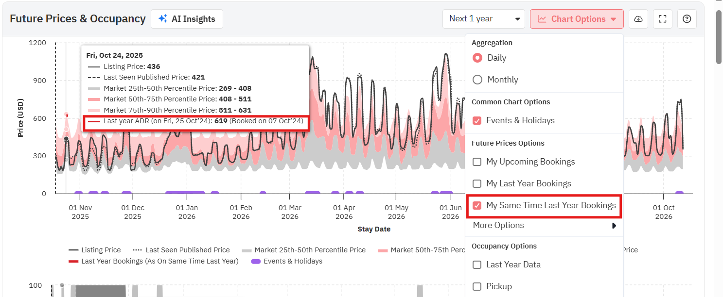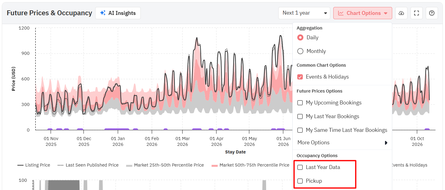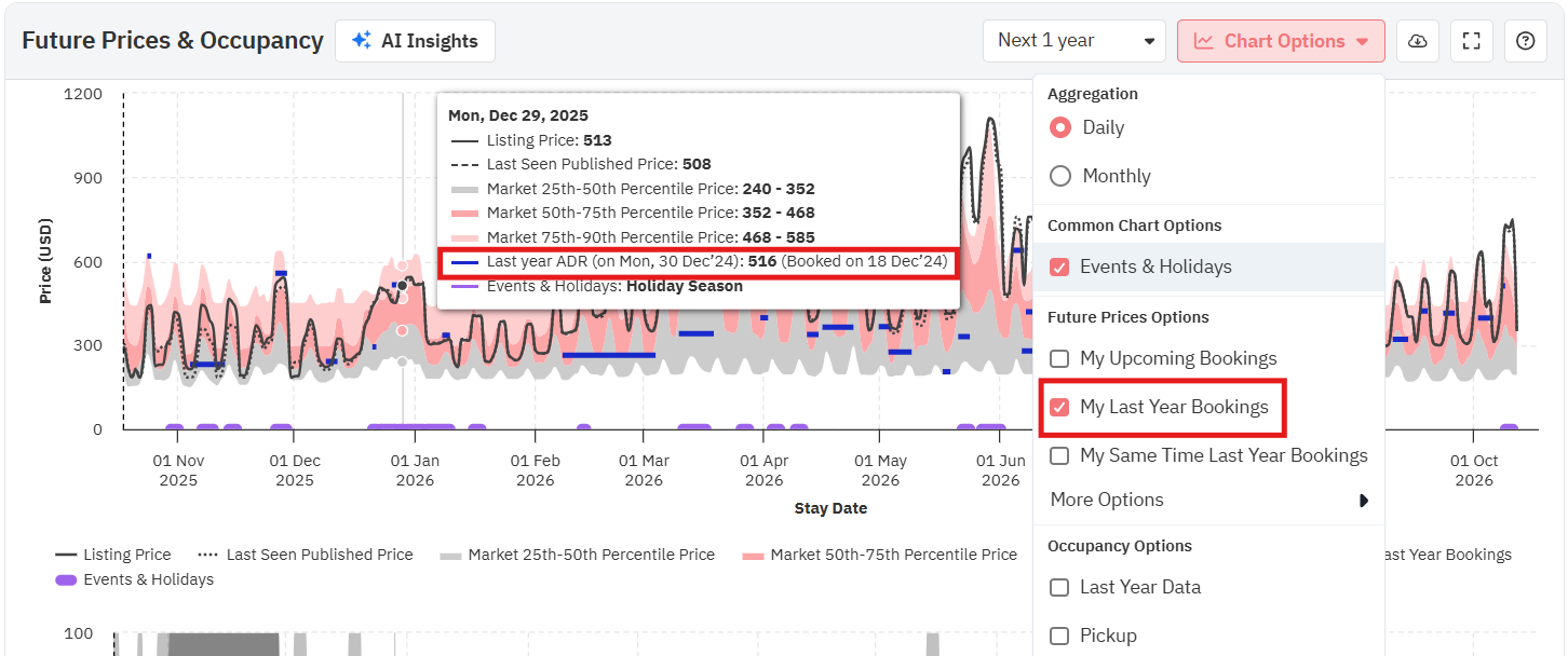 Ao passar o mouse sobre o gráfico, você verá os preços reais para essa data, tanto o último visto quanto o final, juntamente com os preços dos percentis 25, 50 e 75 (o mínimo, a média e o máximo para o seu bairro). Preste atenção a cada campo ao longo do ano; os preços na última visualização e da propriedade irão variar dependendo de como se posicionam em relação aos preços dos concorrentes.