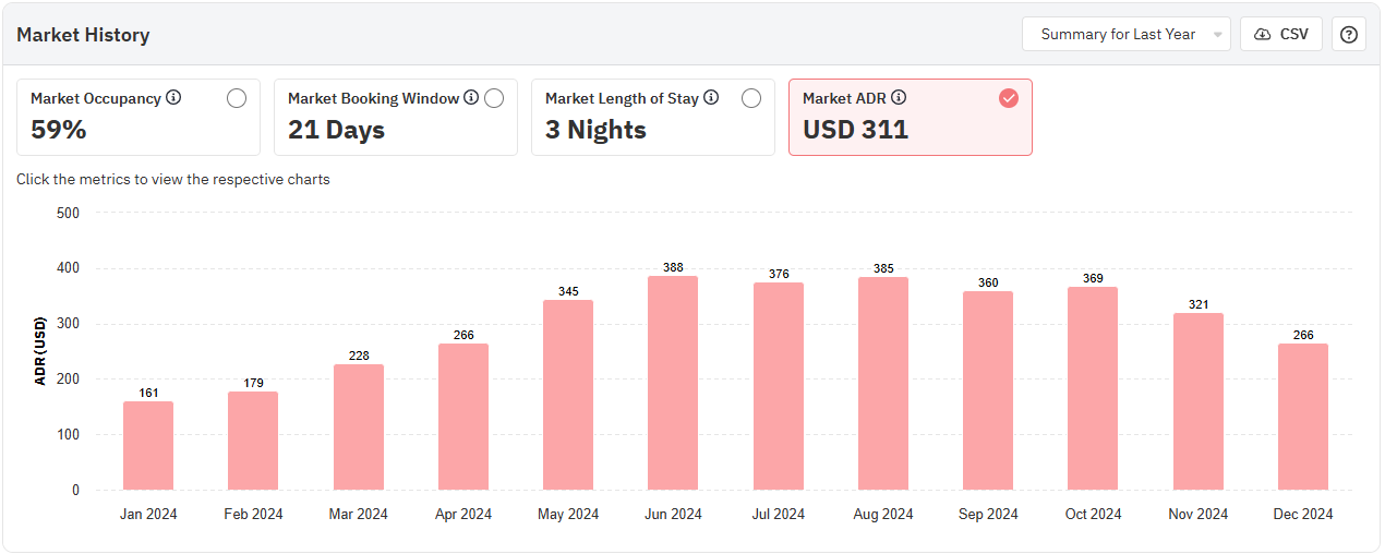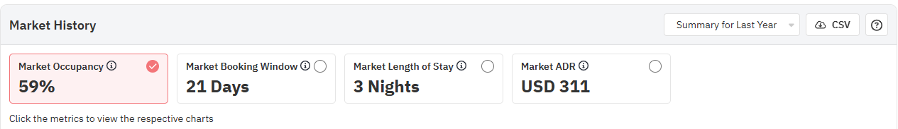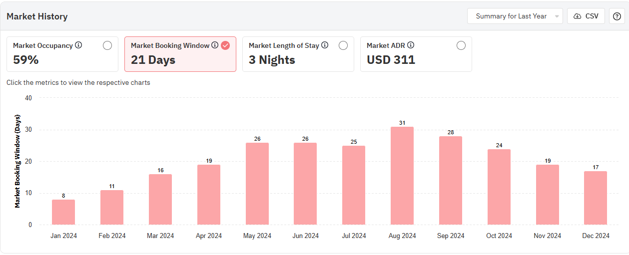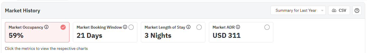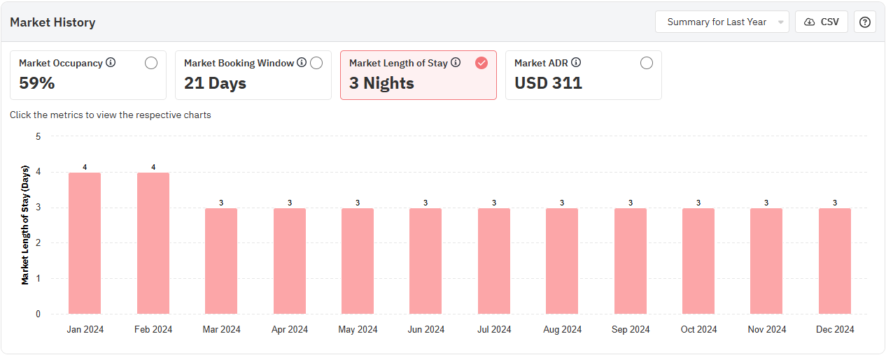 O gráfico de histórico do mercado mostra a ocupação, a janela de reserva, o preço médio da diária e a duração da estadia no seu mercado. Por padrão, o gráfico mostra os dados do último ano, mas pode ser alterado para mostrar os dados dos últimos dois anos.