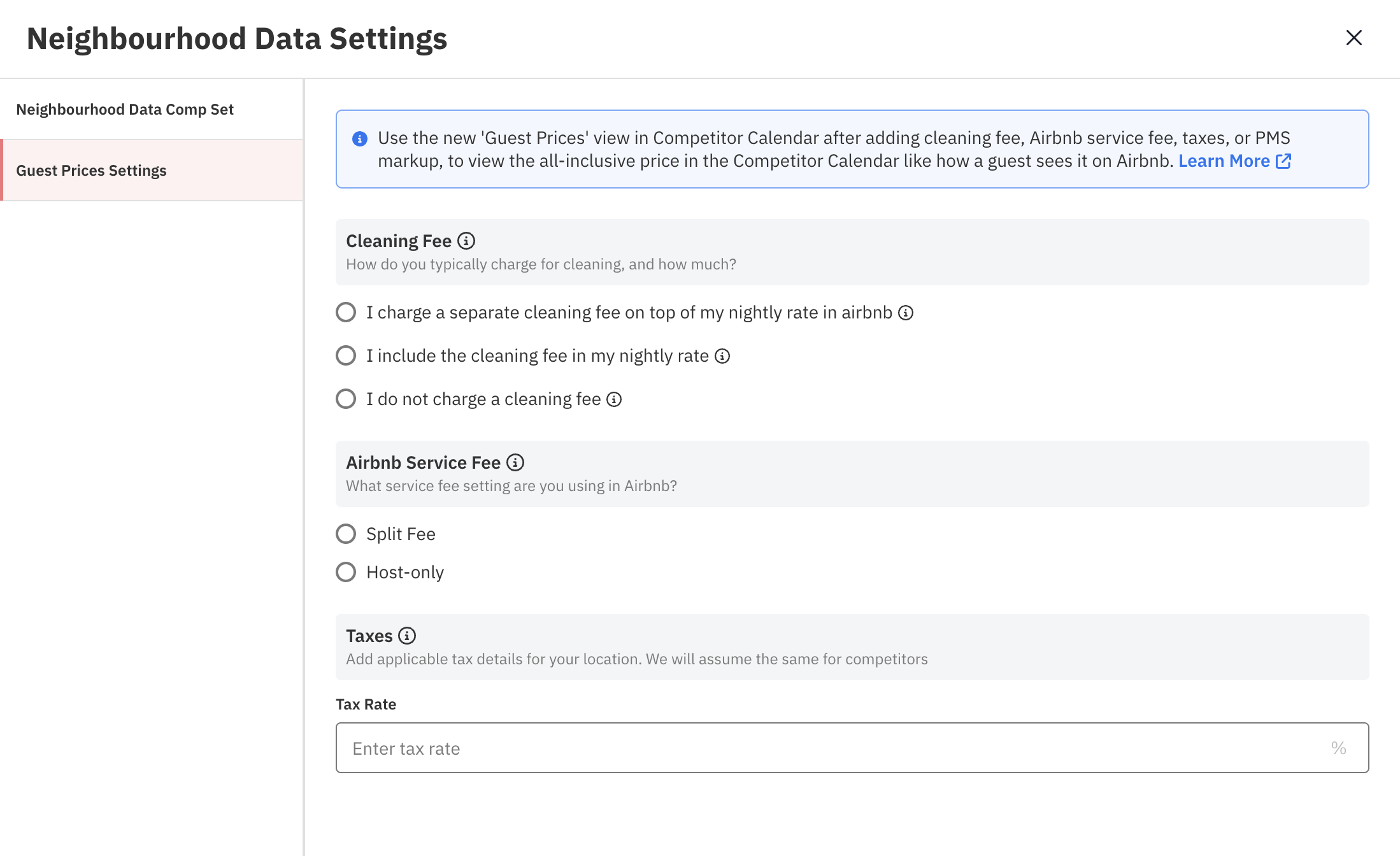Para que possamos calcular os preços para hóspedes da sua propriedade no PriceLabs, você deve informar a taxa de limpeza e a comissão do Airbnb, além de quaisquer markups aplicados pelo PMS/gestores de canais. Observe que obtemos informações sobre concorrentes automaticamente a partir dos dados levantados.