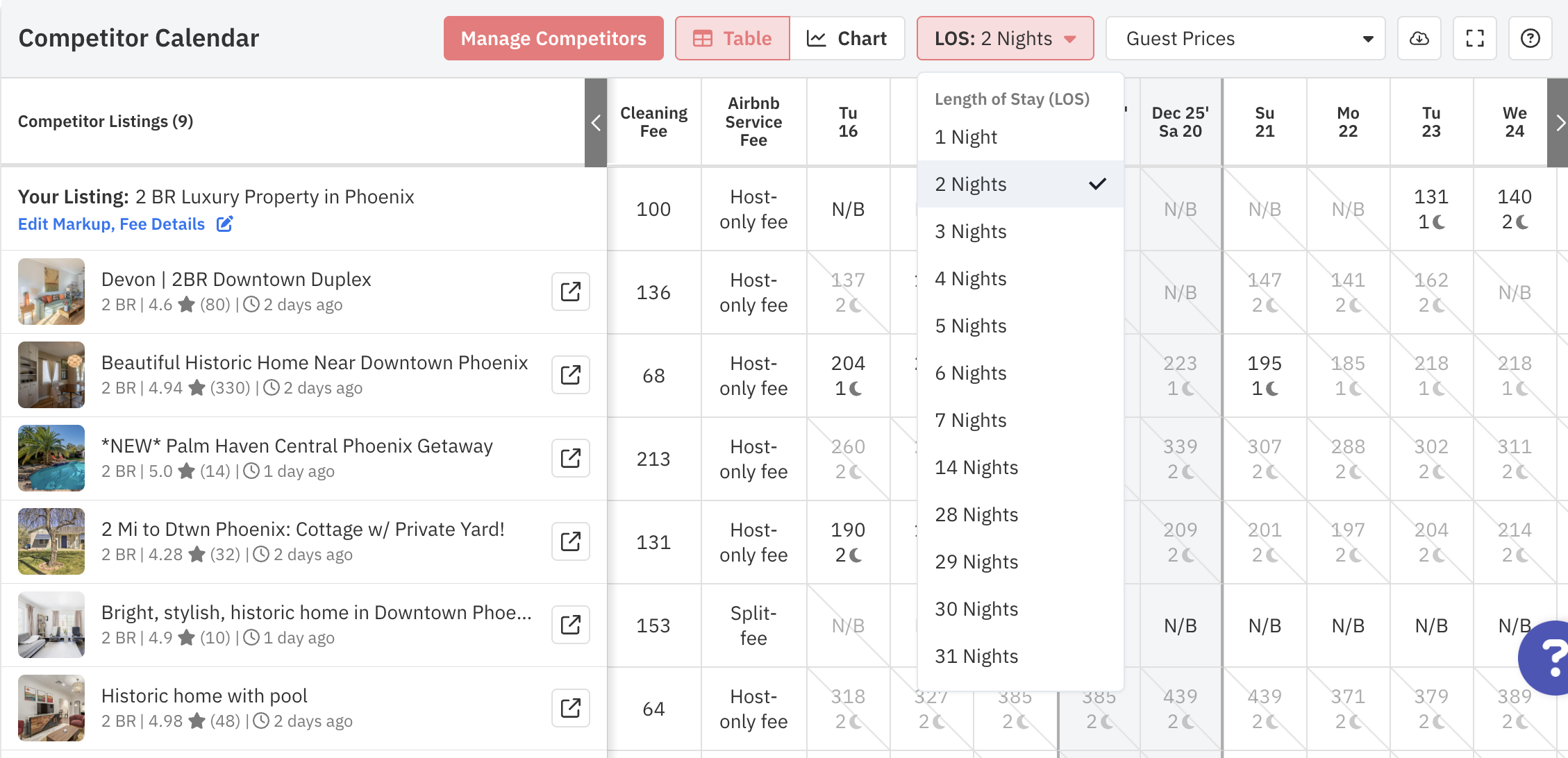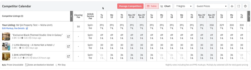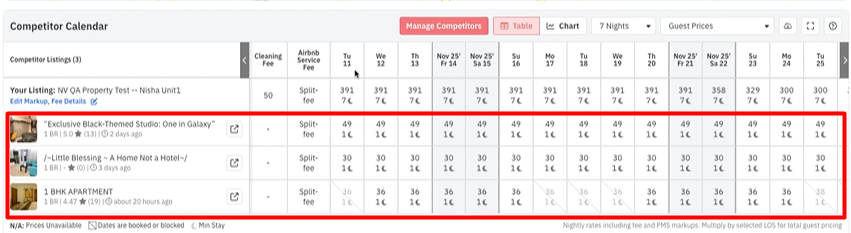 Preços futuros das diárias de concorrentes: Os preços aparecem em negrito, as datas indisponíveis estão em cinza e, ao clicar no nome da propriedade na tabela, será aberto o link correspondente da propriedade no Airbnb/Vrbo.