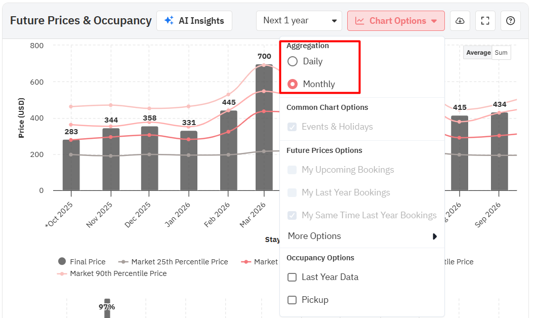 Agregação diária – mostra os preços para cada data específica, oferecendo uma visão detalhada das flutuações diárias. Essa é a abordagem padrão para a maioria das estratégias de aluguel de curto prazo.