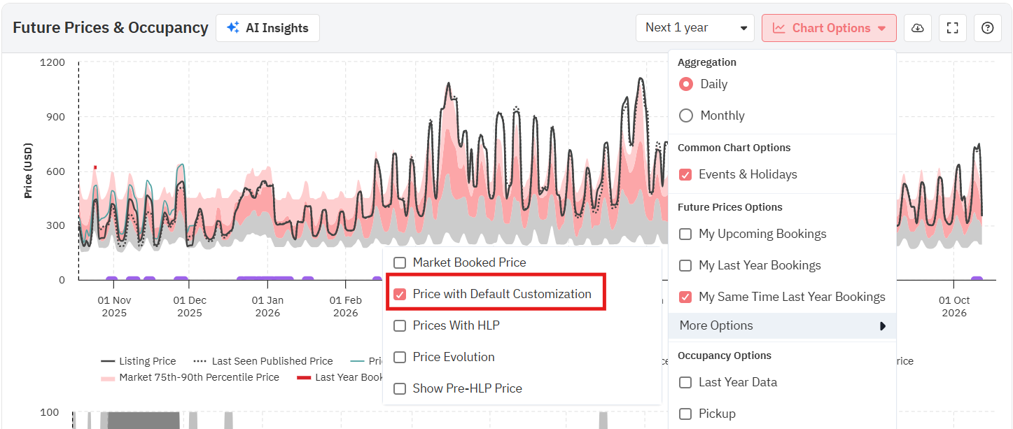 Ao importar sua propriedade para o PriceLabs, também obtemos os preços atuais e históricos dela a partir do seu PMS ou canal de reservas. Ao marcar a caixa "Adicionar ao gráfico os preços antes de usar o PriceLabs" em "Opções do gráfico", você verá uma linha pontilhada vermelha no gráfico de preços futuros que representa como era sua configuração de preços antes de usar o PriceLabs. Essa é uma ótima maneira de comparar os preços que recomendamos com valores atuais no seu PMS/site de reservas e fazer os ajustes necessários, se for o caso.