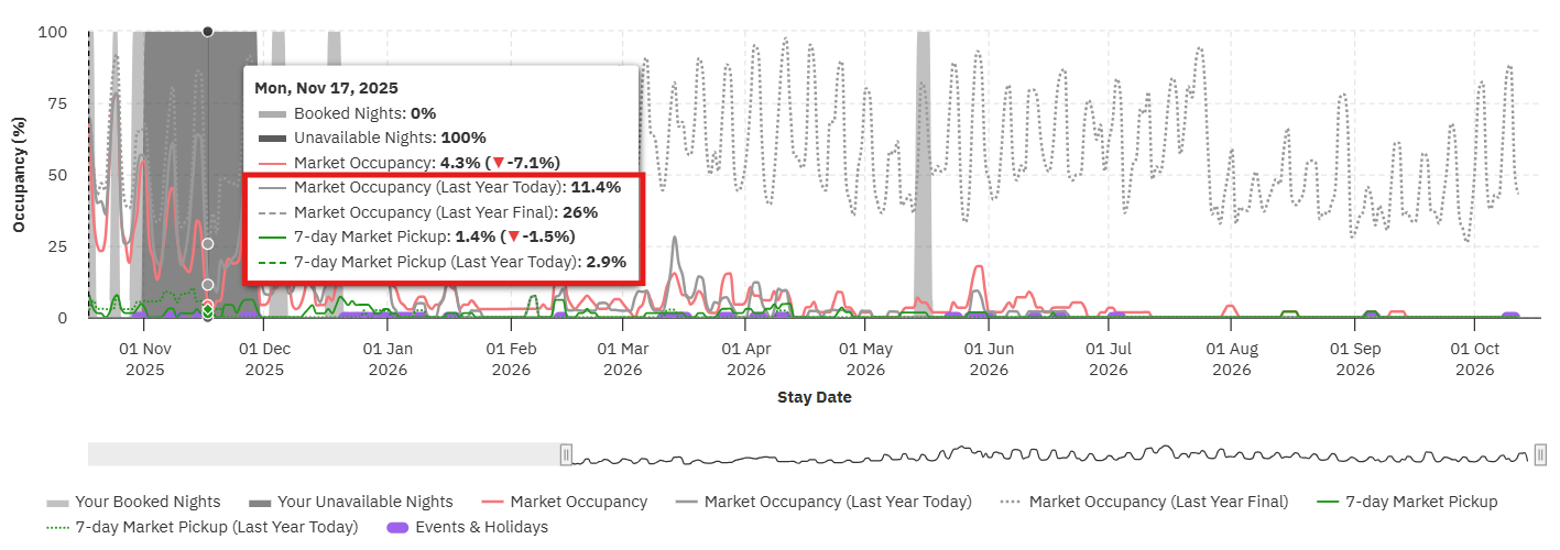 Nesta data há um ano – Esses dados mostram a taxa de ocupação do mercado no mesmo dia do ano passado. Com esses dados, você pode avaliar melhor se as reservas estão chegando mais lentamente, mais rapidamente ou no mesmo ritmo do ano passado.
