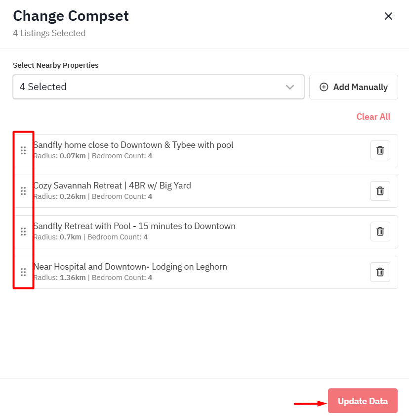 Para selecionar a ordem em que as propriedades são exibidas no seu Calendário da Concorrência, clique no botão "Gerenciar concorrentes" e mova as propriedades para cima ou para baixo usando o ícone de pontos localizado à esquerda de cada propriedade. Em seguida, clique em "Atualizar dados".