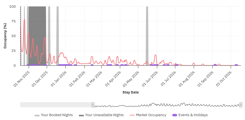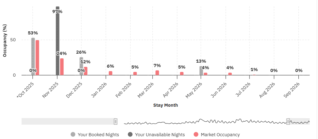 O gráfico de ocupação futura mostra a ocupação média na sua região para cada data do próximo ano em vermelho, sobreposto às datas já bloqueadas para a sua propriedade em cinza. Você também pode ver quais datas foram marcadas como indisponíveis (não reserváveis) em cinza mais claro.