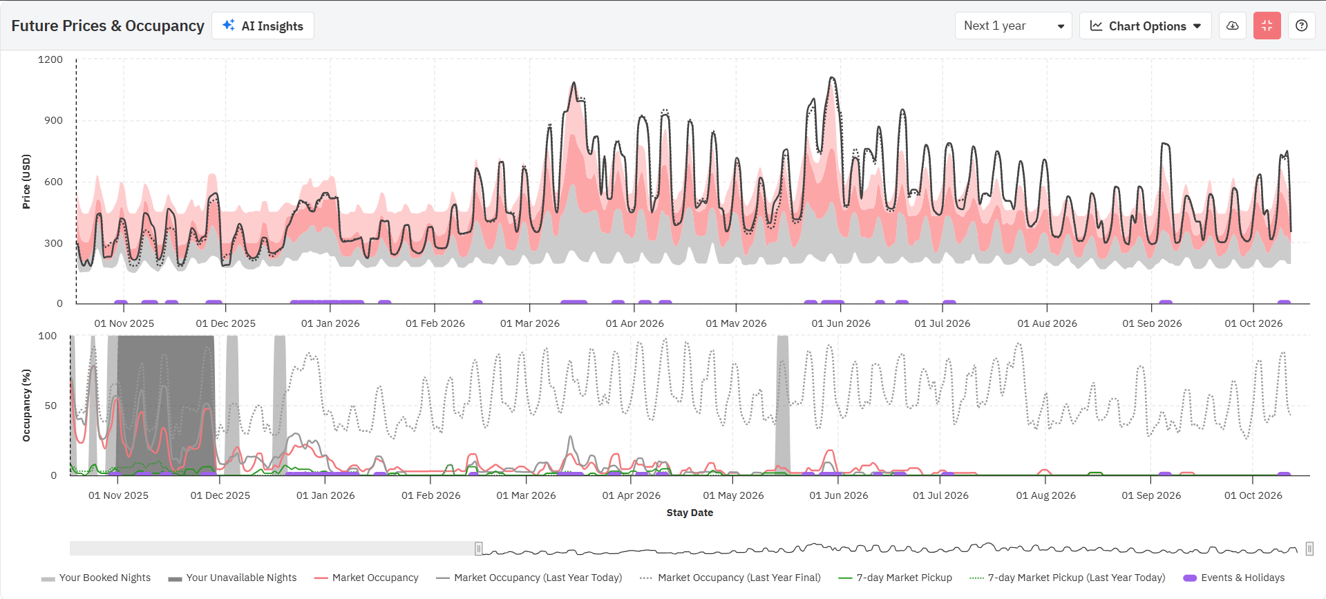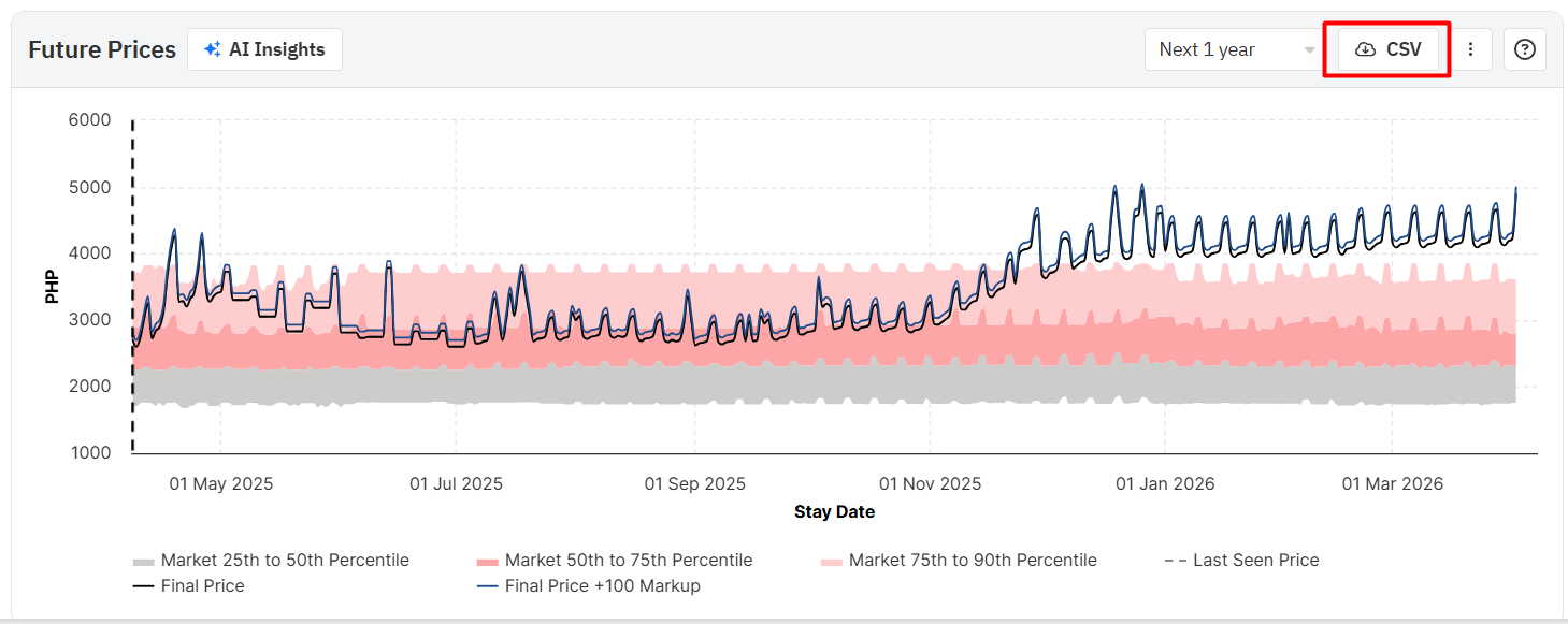 O gráfico de preços futuros mostra o "Último preço visto" (linha pontilhada) e o "Preço final" (linha contínua), juntamente com o intervalo do percentil 25 a 50 (cinza), do percentil 50 a 75 (rosa escuro) e do percentil 75 a 90 (rosa claro) dos preços das diárias para o próximo ano.