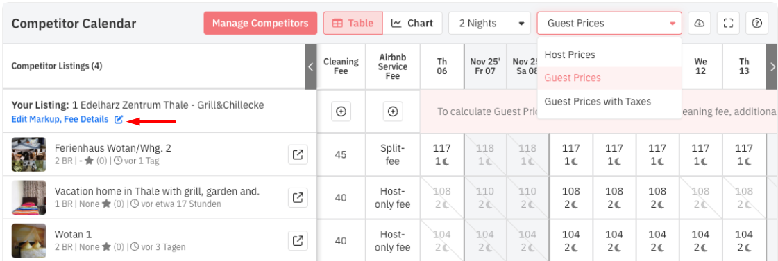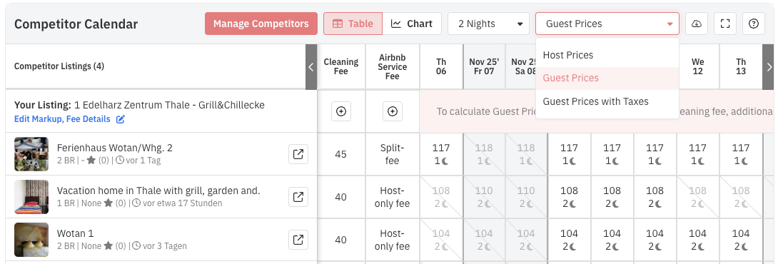 No Calendário da Concorrência, agora você pode alternar entre essas exibições (Preços para o anfitrião vs. Preços para hóspedes) e ver como seus preços aparecem do ponto de vista do hóspede.