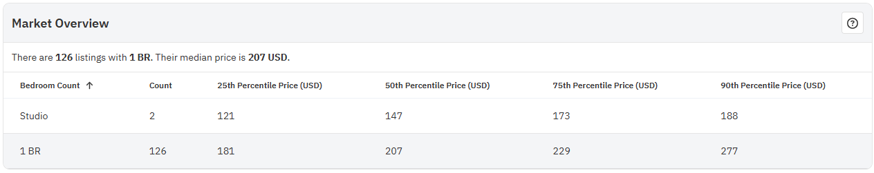 O gráfico de visão geral do mercado mostra a contagem exata de propriedades por número de quartos e exibe a média de preços na faixa baixa, intermediária e alta dessas propriedades, levando em consideração os preços dos últimos 180 dias e dos próximos 180 dias. Entre as 126 propriedades de um quarto nessa área, os preços médios eram US$ 181 por noite na faixa mais baixa, entre US$ 201 e US$ 229 por noite na faixa intermediária, e US$ 277 por noite na faixa mais alta do espectro de preços.