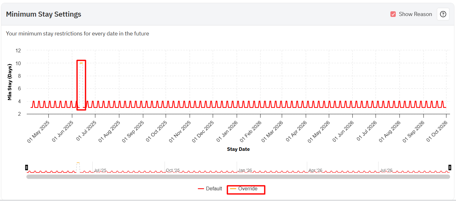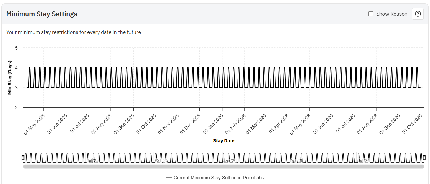 O gráfico de configurações de estadia mínima mostra uma prévia das restrições de estadia que foram aplicadas à sua propriedade durante o período selecionado. Você também pode ver qual regra está sendo aplicada em um dia específico selecionando "Exibir motivos".
