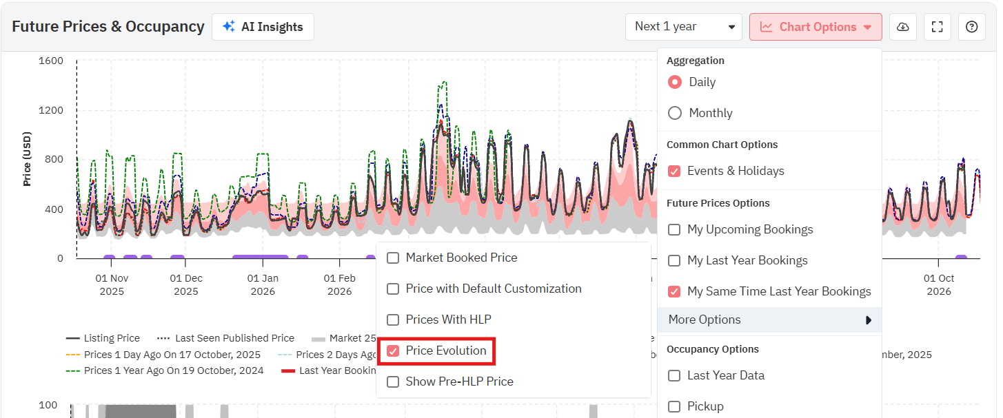 Você pode ativar essa função marcando a caixa "Minhas reservas na mesma época do ano passado" no botão "Opções do gráfico", no gráfico de preços futuros.