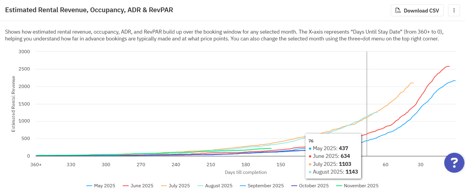 A seção Curvas de reservas no nível do mercado permite visualizar como a receita, a taxa de ocupação, o preço médio da diária e a receita por quarto disponível (RevPAR) se desenvolvem ao longo do tempo no mercado mais amplo. Esses gráficos usam o formato familiar Dias até a reserva (Dias até a conclusão) no eixo X,- variando de mais de 360 dias antes do check-in até a data da estadia, para que você possa observar como o desempenho evolui à medida que as reservas chegam.